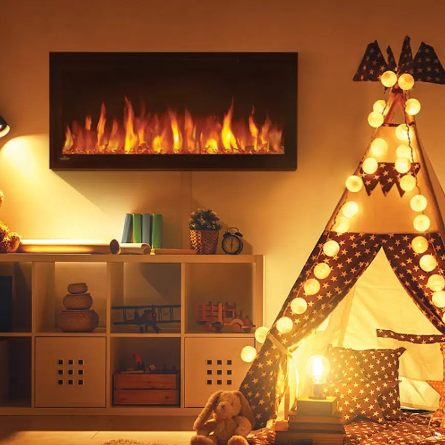 • Easy to install. Hang, plug, and play, or fully recess the fireplace into the wall for a flush look.